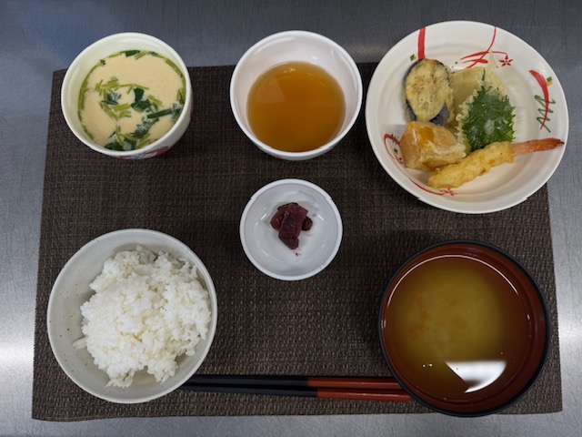 昼食にはてんぷらの盛り合わせや茶わん蒸しをお出しし、おやつにはプリンアラモードをお出ししました。