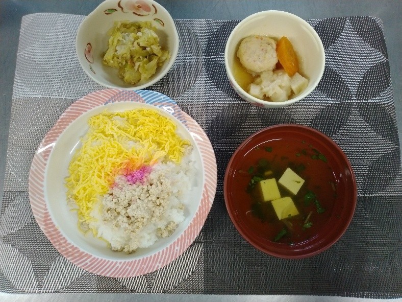 3月3日は雛祭りということで、昼食時にちらし寿司をお出ししました。「味いいがんになっとる。きれいやね。」と言われ、喜んで召し上がられていました。